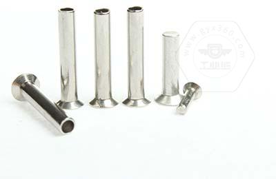 安装时尾部空心部分受挤压向外翻边,形成卡扣,固定连接件。沉头半空心铆钉主要用于表面须平滑,承受载荷不大的铆接场合。
