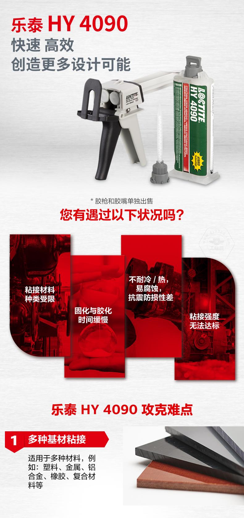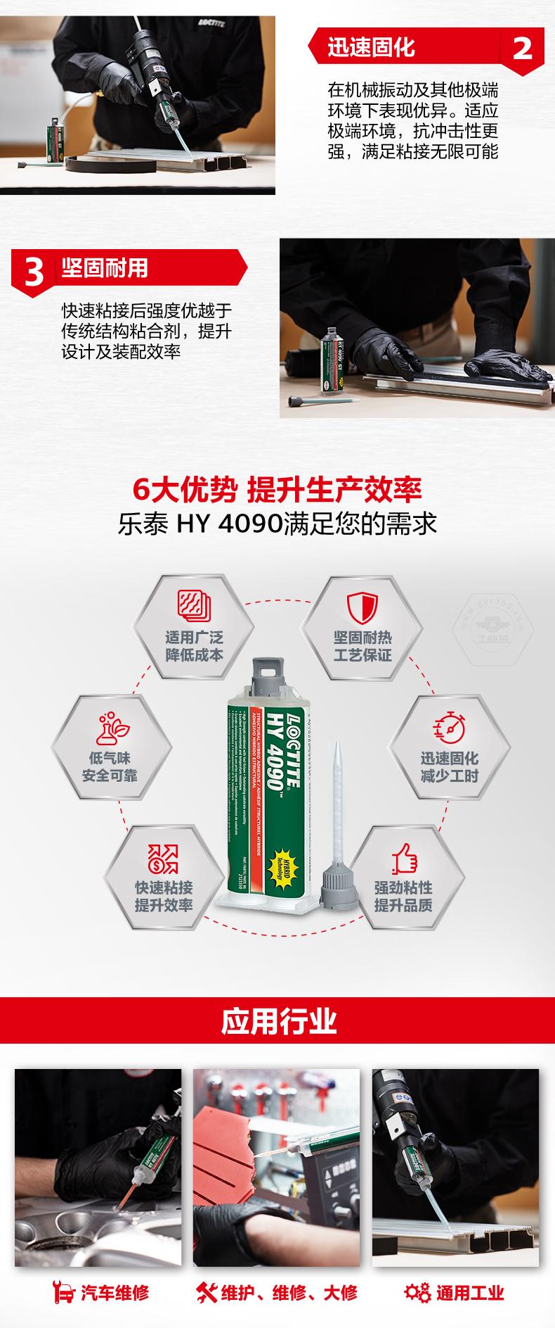 乐泰HY4090主打迅速固化、强劲粘性和多种基材粘接。乐泰HY4090适用于塑料、金属、铝合金、橡胶及复合材料,兼顾低气味、安全可靠。乐泰HY4090在机械振动及其他极端环境下表现优异,快速粘接后强度优于传统结构粘合剂,可提升设计与装配效率,适用于汽车维修、维护维修大修和通用工业。